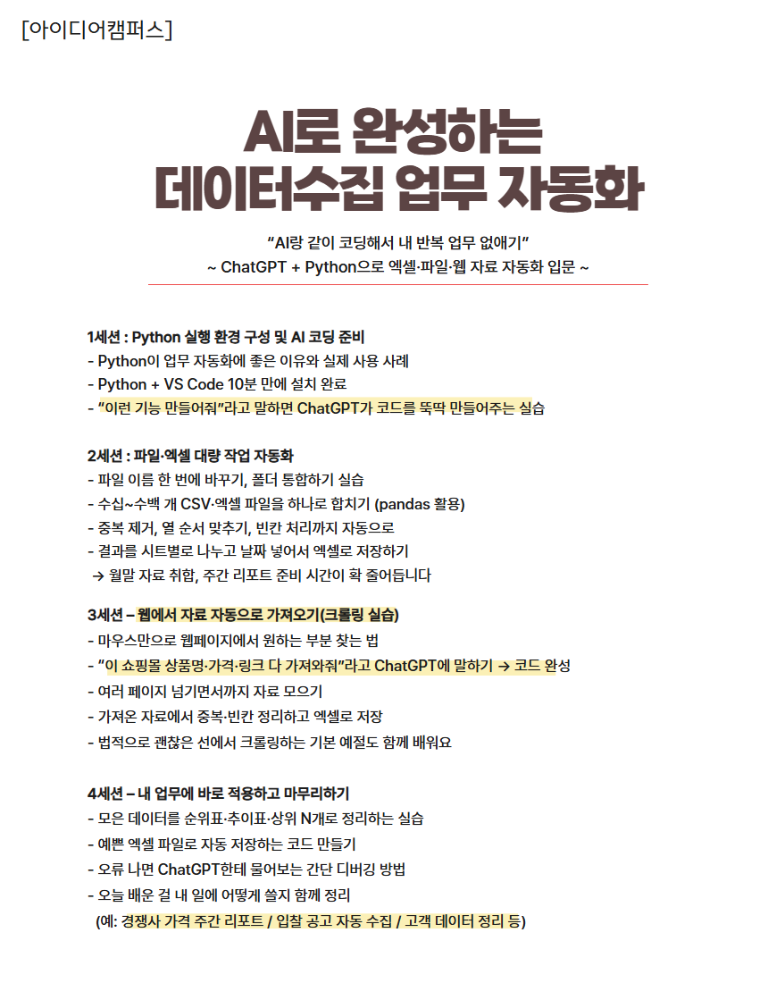 - ChatGPT를 활용하여 크롤링·데이터 가공·파일 처리 등 반복 업무를 생성·수정·디버깅하는 방법을 습득한다.